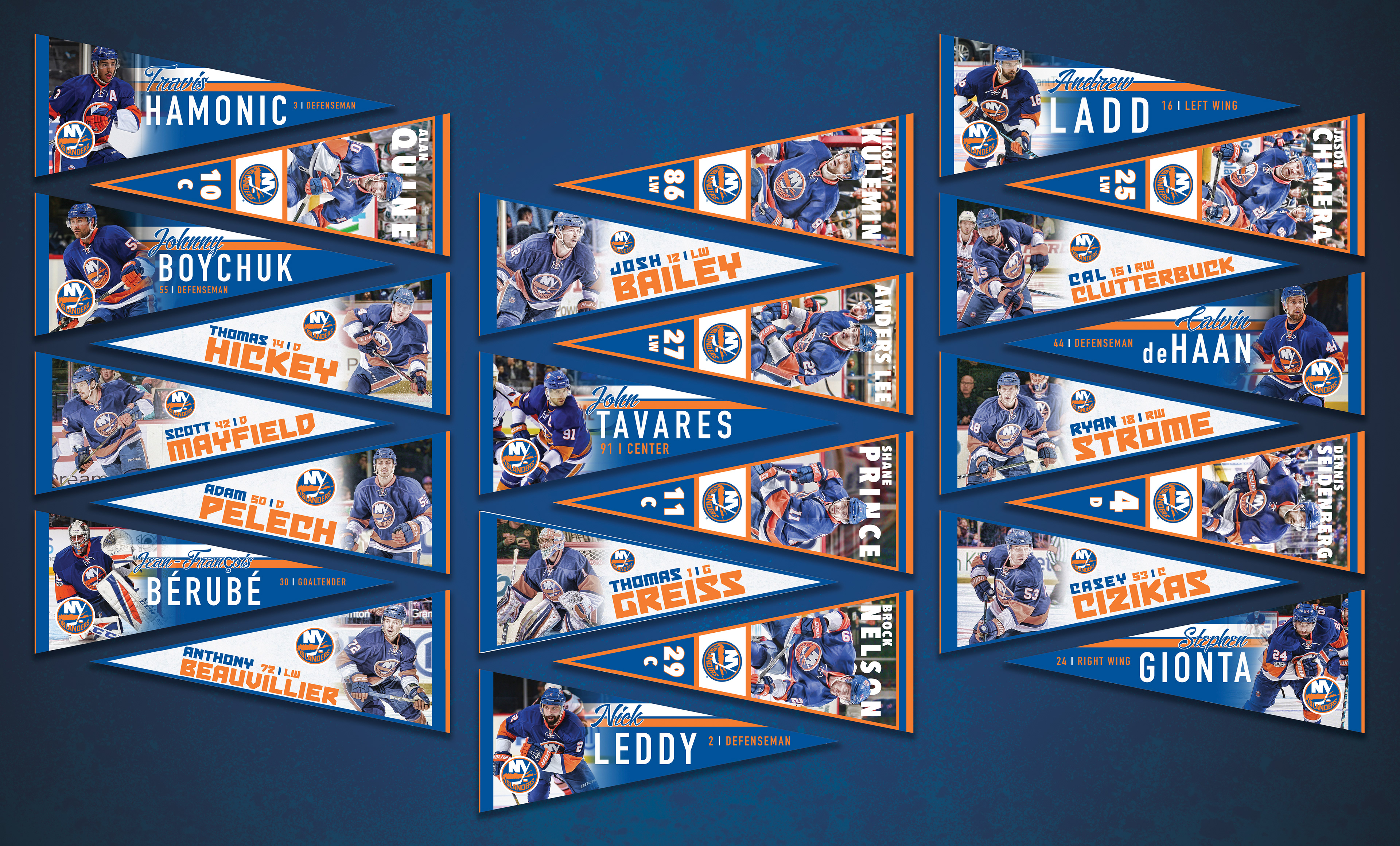 Created three different series of pennants for the New York Islanders that were featured in a display piece at Northwell Health Ice Center. The Pennant Display was 3D with several of the pennants popping off of the background. All of the players on the 2016-17 Islanders roster were featured.